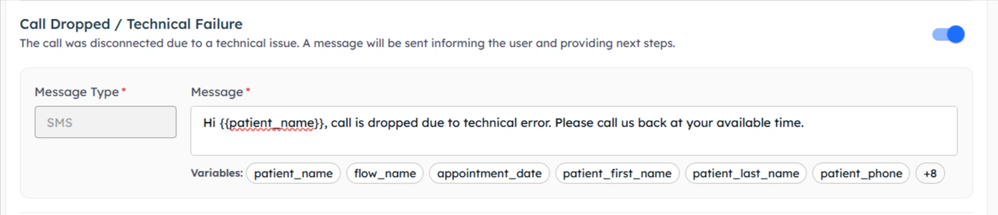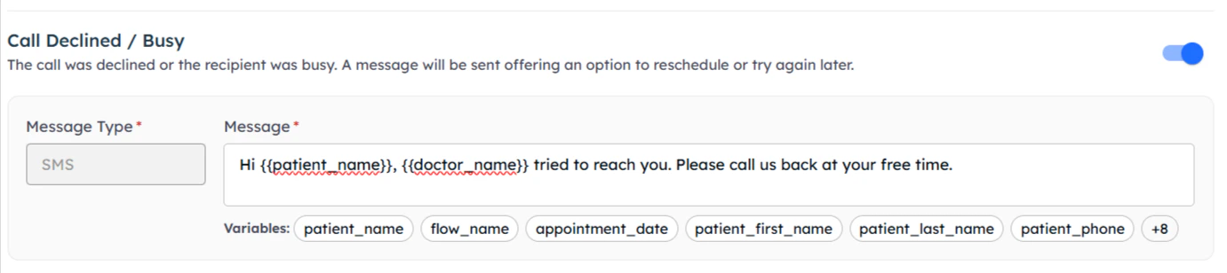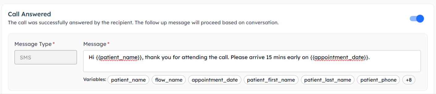 Post-call messages provide targeted follow-up based on specific call outcomes, ensuring continued engagement regardless of call results.Configure different messages for each possible call outcome to maintain engagement and provide appropriate next steps.