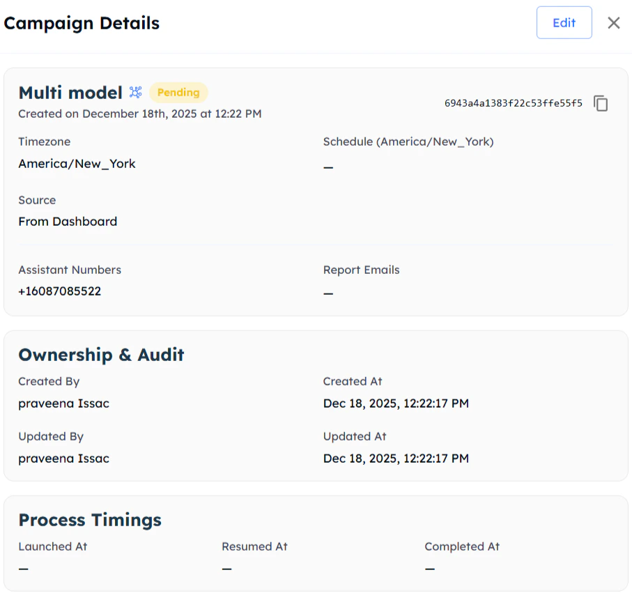 Important: If your campaign completes all calls before reaching later scheduled dates, those remaining dates will be skipped automatically.Example: If you schedule 3 days but all contacts are successfully called on day 1, days 2 and 3 won’t execute.This ensures efficient resource usage and prevents unnecessary processing.
