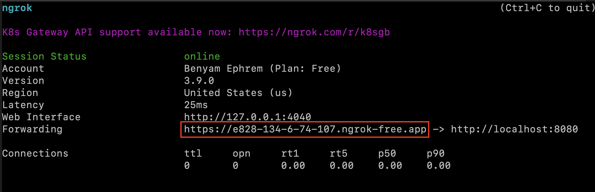 You will see an output from the Ngrok Agent CLI that looks like the following: