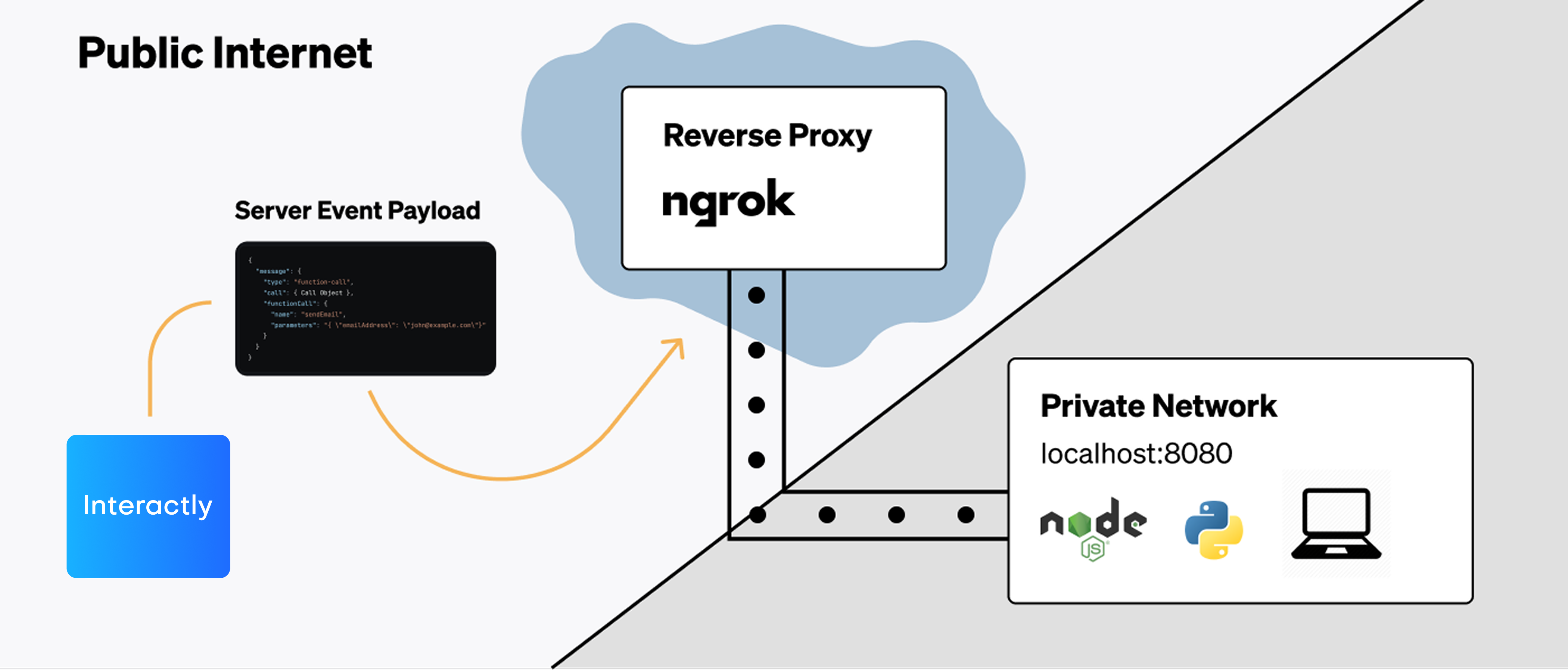 When Interactly dispatches events to a server, it must be able to reach the server via the open Internet. If your API is already live in production, it will be accessible via a publicly known URL. But, during development, your server will often be running locally on your machine.localhost is an alias for the IP address 127.0.0.1. This address is called the “loopback”